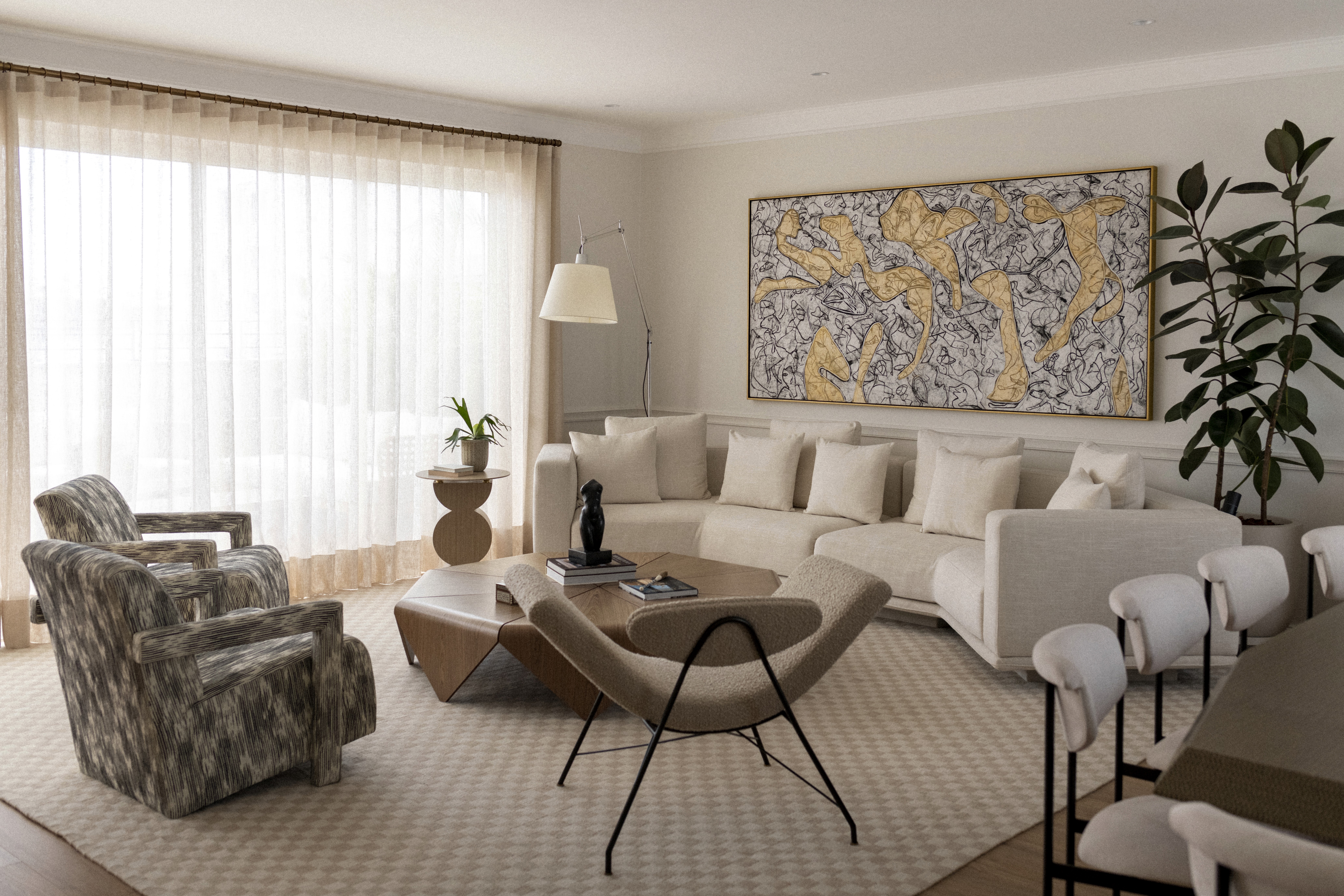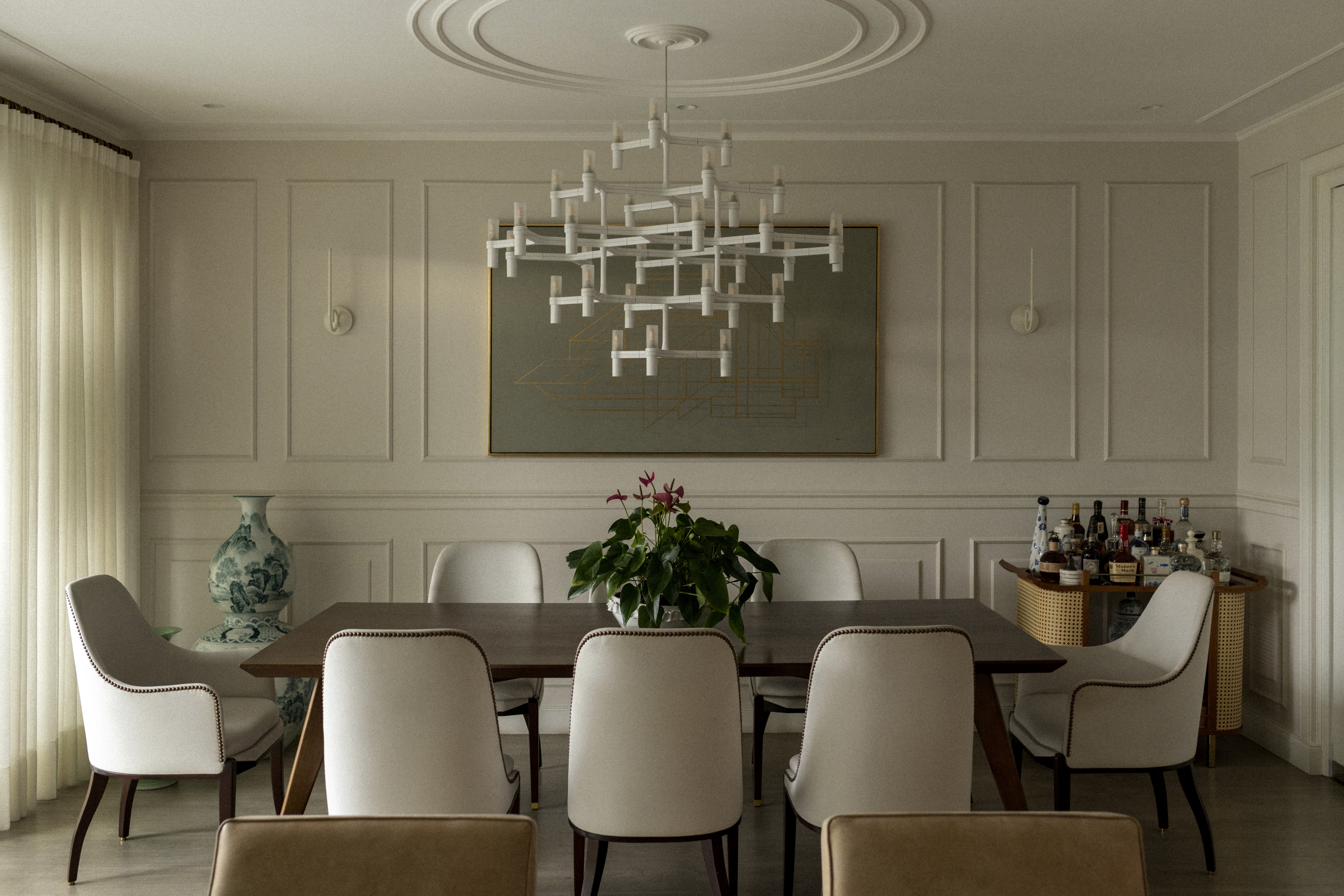 The space should convey a serene, restrained, and deeply elegant architecture, built upon a palette of natural tones and materials with presence. The envelope is structured through reinterpreted classical moldings, clean lines, and balanced proportions, creating an environment that dialogues between tradition and contemporaneity.